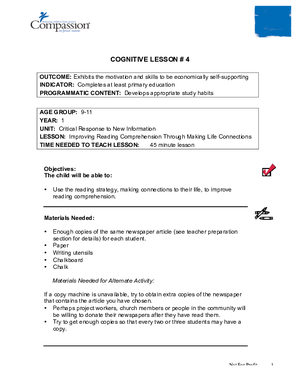 The lesson “Improving Reading Comprehension Through Making Life Connections” works with children to develop reading strategies in order to improve comprehension. The children learn to make connections to their own lives with the text while they are reading in order to better understand and interpret the information. The lesson includes guided instructions for the teacher, including preparation, a script, and suggested activities to facilitate further learning in a fun and interactive manner. This lesson is designed for children between 9-11 years, and is the 4th lesson in the 1st Year “Critical Response to New Information” unit.
