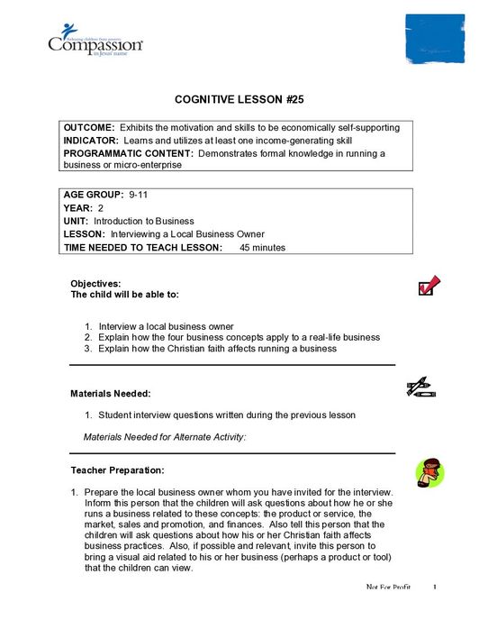 The lesson “Interviewing a Local Business Owner” gives children the opportunity use the questions developed in the previous lesson and ask them of a local business owner in an interview. The children will learn how the four concepts apply to real-life businesses, as well as how the Christian faith affects running a business. The lesson includes guided instructions for the teacher, including preparation, a script, and suggested activities to facilitate further learning in a fun and interactive manner. This lesson is designed for children between 9-11 years, and is the 25th lesson in the 2nd Year “Introduction to Business” unit.