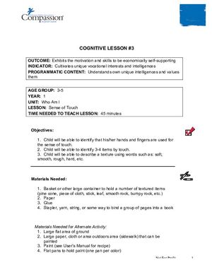The lesson “Sense of Touch” teaches children to identify that their hands and fingers are used for the sense of touch. The children will identify 3-4 items by touch and describe a texture using words such as “soft,” smooth,” “rough,” “hard,” etc. The lesson includes guided instructions for the teacher, including preparation, a script, and suggested activities to facilitate further learning in a fun and interactive manner. This lesson is designed for children between 3-5 years, and is the 3rd lesson in the 1st Year “Who Am I?” unit.