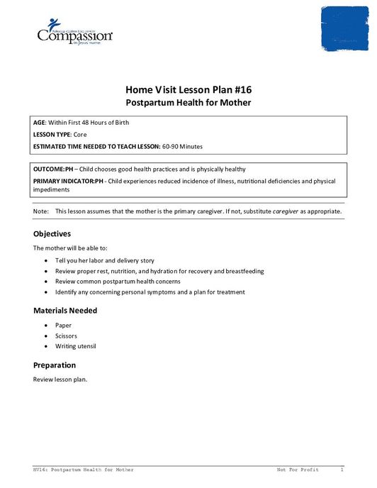 The lesson “Postpartum Health for Mother” builds her ability to tell her labor and delivery story. This lesson also discusses ways to ensure proper rest, nutrition and hydration for recovery during breastfeeding. After this lesson, the mother will be able to identify common postpartum health concerns, as well as know how to address personal symptoms and make a plan for treatment.