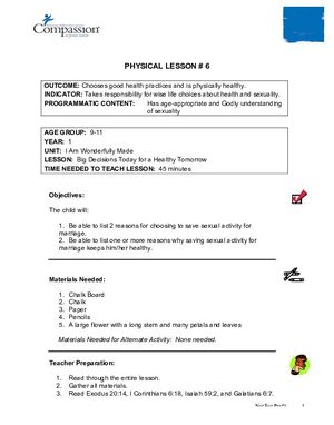 The lesson “Big Decision Today for a Healthy Tomorrow” is part six of a 46 part series on human development, the human body, health, and safety. This lesson teaches about the role of a sexual relationship within marriage, as God designed. This resource includes a lesson plan for the teacher on how to prepare beforehand, class-time content to facilitate learning, hands-on activities facilitating further learning, and a teacher assessment at the end. This lesson is designed for a group of young children between the ages of 9 and 11, and is the sixth physical development lesson in the Core Curriculum, 9-11 years, Year One.