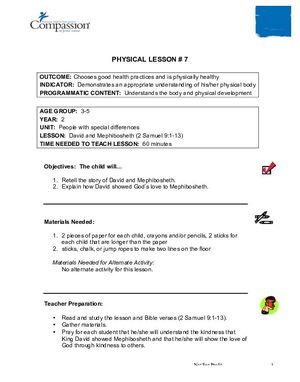 The lesson “David and Mephibosheth” is part seven of a 44 part series on human development, family, health, and safety. This lesson teaches the biblical story of David being kind to Mephibosheth, who was disabled. This resource includes a lesson plan for the teacher on how to prepare beforehand, class-time content to facilitate learning, hands-on activities facilitating further learning, and a teacher assessment at the end. This lesson is designed for a group of young children between the ages of 3 and 5, and is the seventh physical development lesson in the Core Curriculum, 3-5 years, Year Two.