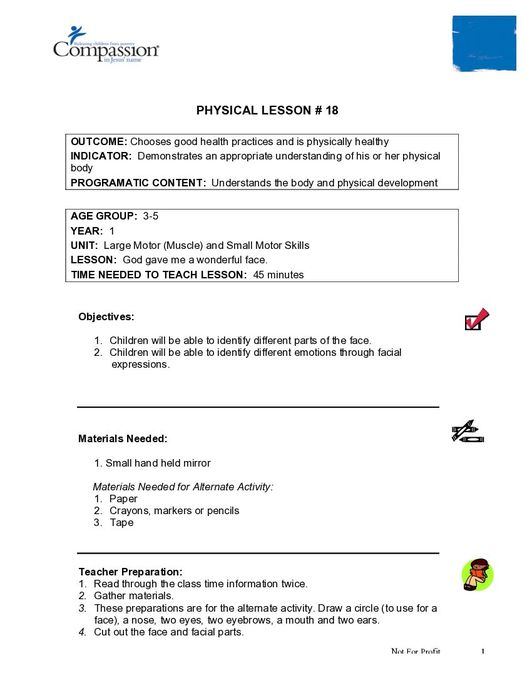 The lesson “God Gave Me a Wonderful Face” is part 18 of a 42 part series on parts of the human body, health, and safety. This lesson focuses on identifying the parts of the face and using faces to recognize emotions. This resource includes a lesson plan for the teacher on how to prepare beforehand, class-time content to facilitate learning, hands-on activities facilitating further learning, and a teacher assessment at the end. There is also an alternate activity suggested. This lesson is designed for a group of young children between the ages of 3 and 5, and is the eighteenth physical development lesson in the Core Curriculum, 3-5 years, Year One.