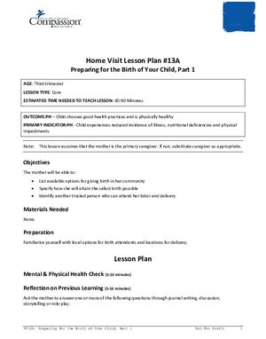 The lesson “Preparing for the Birth of your Child, Part 1” helps prepare the mother with a list of available options for giving birth in her community. This lesson also helps her determine how to have the safest birth possible and identify a trusted person who can attend her labor and delivery.