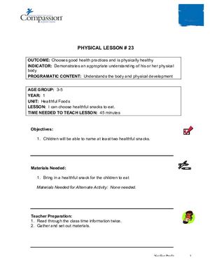 The lesson “I Can Choose Healthful Snacks to Eat” is part 23 of a 42 part series on parts of the human body, health, and safety. This lesson focuses on identifying healthy foods that are good for human bodies and give energy. This resource includes a lesson plan for the teacher on how to prepare beforehand, class-time content to facilitate learning, hands-on activities facilitating further learning, and a teacher assessment at the end. This lesson is designed for a group of young children between the ages of 3 and 5, and is the twenty-third physical development lesson in the CoreCurriculum, 3-5 years, Year One.
