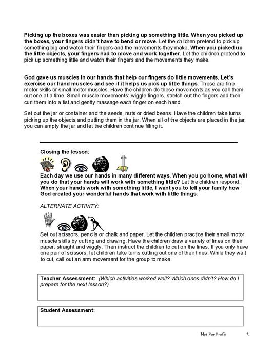 The lesson “I Can Pick up Small Objects with My Hands” is part 13 of a 42 part series on parts of the human body, health, and safety. This lesson teaches using small objects like beans to increase hand/eye coordination. This resource includes a lesson plan for the teacher on how to prepare beforehand, class-time content to facilitate learning about the arms, hands-on activities facilitating further learning, and a teacher assessment at the end. There is also an alternative activity suggested. This lesson is designed for a group of young children between the ages of 3 and 5, and is the thirteenth physical development lesson in the Core Curriculum, 3-5 years, Year One.