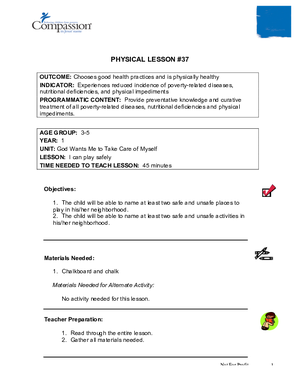 The lesson “I Can Play Safely” is part 37 of a 42 part series on parts of the human body, health, and safety. This lesson focuses on safe ways to play and safe places to play for children. The lesson talks about unsafe places to play like railroad tracks, streets, and condemned buildings and unsafe items to play with, like fire or sharp objects. This resource includes a lesson plan for the teacher on how to prepare beforehand, class-time content to facilitate learning, hands-on activities facilitating further learning, and a teacher assessment at the end. This lesson is designed for a group of young children between the ages of 3 and 5, and is the thirty-seventh physical development lesson in the Core Curriculum, 3-5 years, Year One.