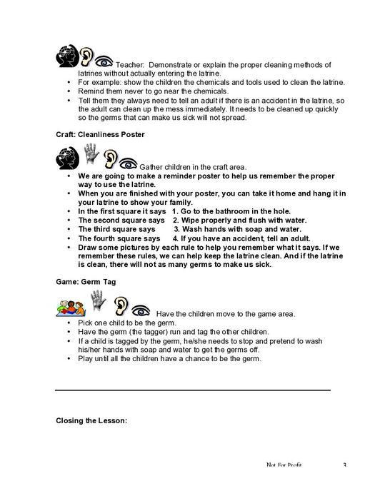 The lesson “I Can Take Care of My Latrine” is part 36 of a 44 part series on human development, family, health, and safety. This lesson teaches about the importance of keeping bathrooms clean and hand washing. This resource includes a lesson plan for the teacher on how to prepare beforehand, class-time content to facilitate learning, hands-on activities facilitating further learning, and a teacher assessment at the end. This lesson is designed for a group of young children between the ages of 3 and 5, and is the thirty-sixth physical development lesson in the Core Curriculum, 3-5 years, Year Two.