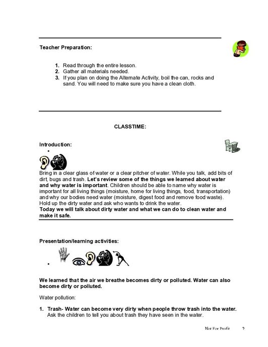 The lesson “Water Pollution and Making Water Safe” is part 27 of a 46 part series on human development, the human body, health, and safety. This lesson teaches about water pollution and making water safe for humans to drink. This resource includes a lesson plan for the teacher on how to prepare beforehand, class-time content to facilitate learning, hands-on activities facilitating further learning, and a teacher assessment at the end. There is also an alternate activity suggested. This lesson is designed for a group of young children between the ages of 6 and 8, and is the twenty- seventh physical development lesson in the Core Curriculum, 6-8 years, Year Two.