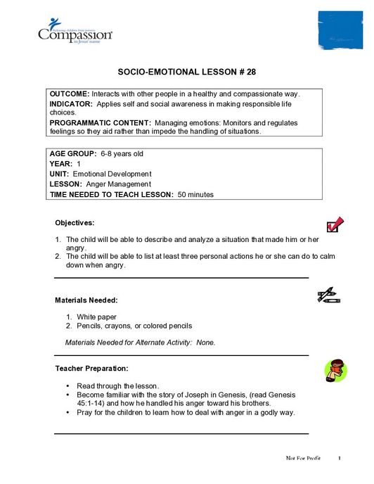 The lesson “Anger Management” teaches children the importance of monitoring feelings in order to aid, rather than impede, in the handling of situation. The children learn to describe and analyze situations that make them feel angry and then are equipped with at least three personal actions to undertake in order to calm down when angry. The lesson includes guided instructions for the teacher, including preparation, a script, and suggested activities to facilitate further learning in a fun and interactive manner. This lesson is designed for children between 6-8 years, and is the 28th lesson in the 1st Year Core Curriculum Set and part of the “Emotional Development” unit.