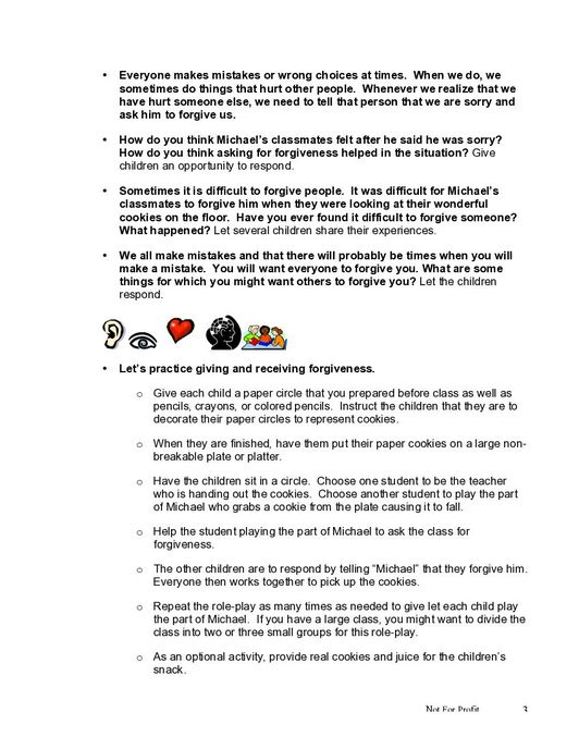 The lesson “Giving and Receiving Forgiveness” teaches children the effectiveness of healthy interpersonal skills, specifically forgiveness. Through story telling and role-playing, the children are able to understand and explain how everyone sometimes makes mistakes, and that it is both necessary and compassionate to express forgiveness. Each child will practice both expressing remorse for a mistake and asking for forgiveness, but also extending forgiveness to another child who asks. The lesson includes guided instructions for the teacher, including preparation, a script, and suggested activities to facilitate further learning in a fun and interactive manner. This lesson is designed for children between 3-5 years, and is the 37th lesson in the 1st Year Core Curriculum Set and part of the “Emotional Development” unit.