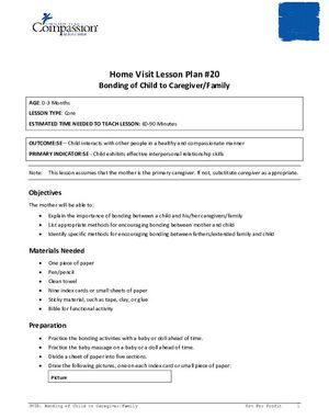 The lesson “Bonding of Child to Caregiver/Family” helps a caregiver understand the importance of bonding with her newborn. It explains various methods of bonding, such as eye contact, facial expressions and soothing physical touch. There are also opportunities for the caregiver, father and other close family to practice bonding methods. Lastly, this lesson addresses recognizing the signs of postpartum depression and its detrimental effect on bonding with a newborn.
