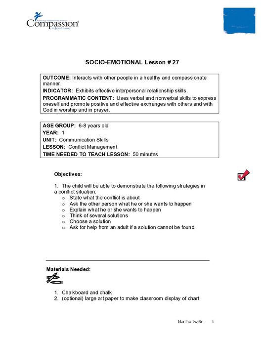 The lesson “Conflict Resolution Skills” teaches children to demonstrate appropriate and positive strategies in conflict situations, inclu…