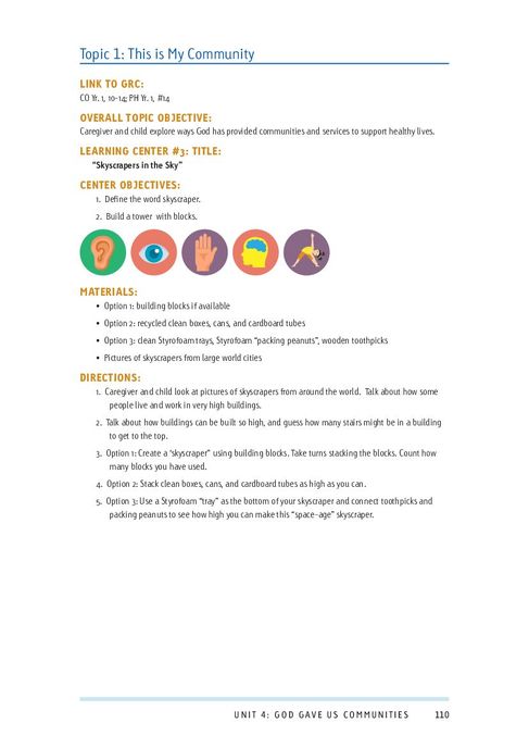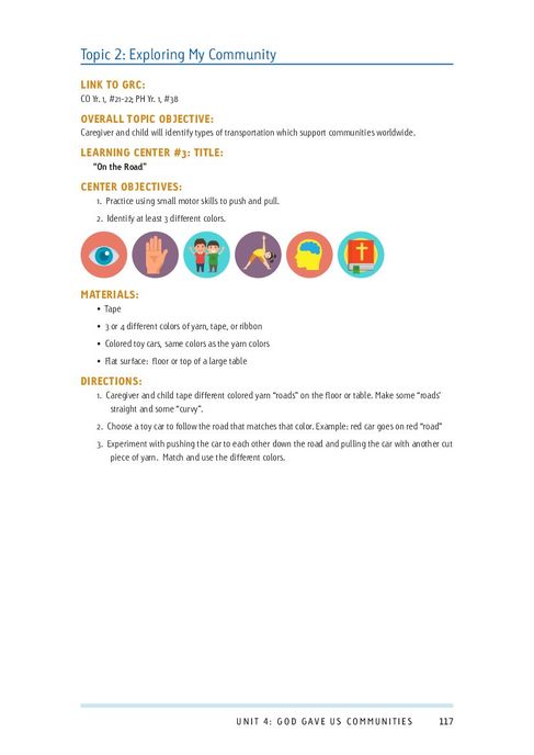 This document is a part of the Supplemental Curriculum (3-5 Year Old), which is a set of resources designed to accompany Compassion International’s Global Resource Curricula (GRC) to provide a rich, interactive learning experience for caregivers and children ages 3-5, with age appropriate and developmentally integrated curriculum. Unit 4: God Gave Us Communities, contains lessons on the following topics: “This is My Community” and “Exploring My Community.”